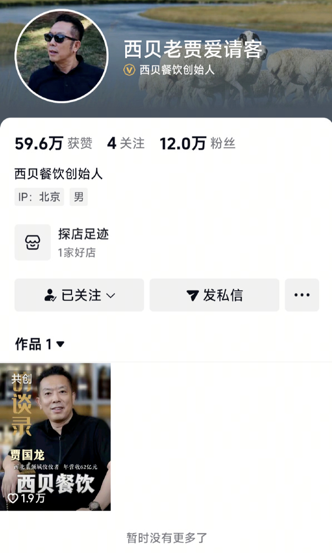 此外,其抖音账号目前仅保留一条公开视频作品。该作品发布于2024年9月30日,该视频为“大熊专访贾国龙”,涉及西贝餐饮成长史,称西贝是西北菜领域佼佼者、年营收达62亿。
