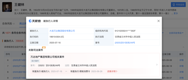 据天眼查,相关案件执行标的为1.86亿元,执行法院为甘肃省兰州市中级人民法院。进展详情显示,9月26日,王健林等人被限制高消费。