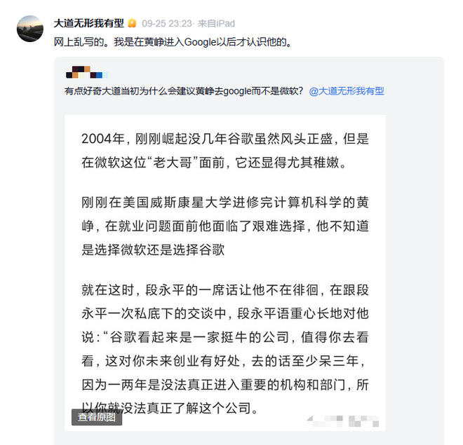 段永平转发网友提问回答称,“网上都是乱写的,我是在黄峥进入Google以后才认识他的。”
