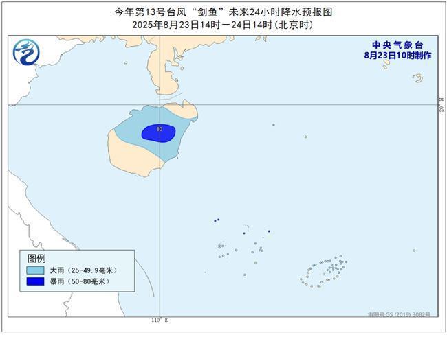 降水预报:8月23日14时至24日14时,海南岛部分地区、西沙群岛、中沙群岛将有大到暴雨(50~80毫米)。