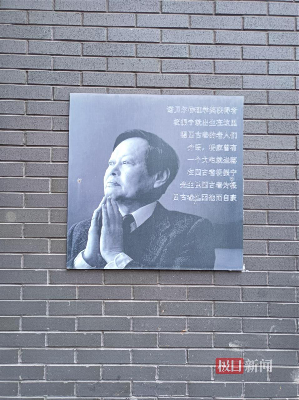 记者看到,小区院墙目前已成为文化墙,上面挂着多幅杨振宁的照片,其中有十个月大的杨振宁与父母在故居外的合影、杨振宁与家人的合影,还有杨振宁与邓稼先的合影。记者注意到,有关部门在做文化墙时,特意悬挂了一张杨振宁的肖像照,并在配文里写道:先生以四古巷为根,四古巷也因他而自豪。