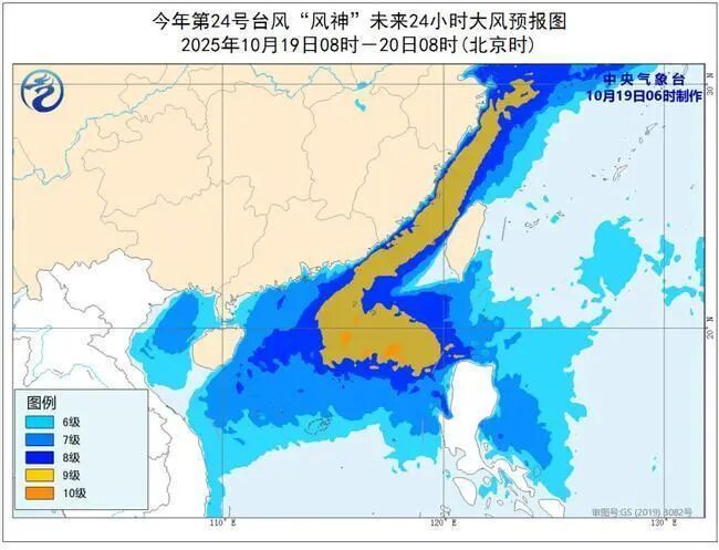 大风预报:受冷空气和“风神”的共同影响,19日08时至20日08时,台湾海峡、巴士海峡、南海北部和中部、西沙群岛、中沙群岛及黄岩岛附近海域、北部湾、琼州海峡、东海西部、浙江沿海、台湾沿海、福建沿海、广东沿海、广西沿海、海南岛沿海将有6-8级大风,阵风9-10级,其中东海西部、浙江沿海、台湾海峡、台湾西部沿海、福建沿海、广东东部沿海和南海东北部的部分海域风力有9-10级,阵风11-12级。