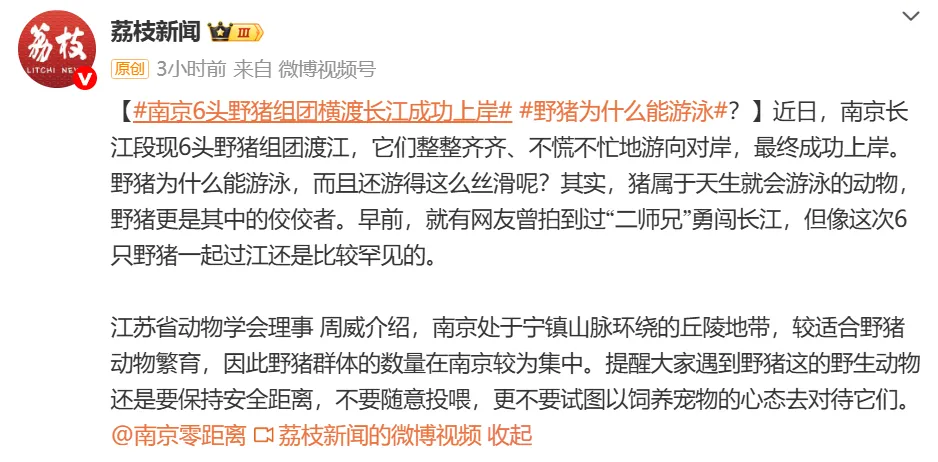 近日,南京长江段现6头野猪组团渡江,它们整整齐齐、不慌不忙地游向对岸,最终成功上岸。野猪为什么能游泳,而且还游得这么丝滑呢?其实,猪属于天生就会游泳的动物,野猪更是其中的佼佼者。早前,就有网友曾拍到过“二师兄”勇闯长江,但像这次6只野猪一起过江还是比较罕见的。