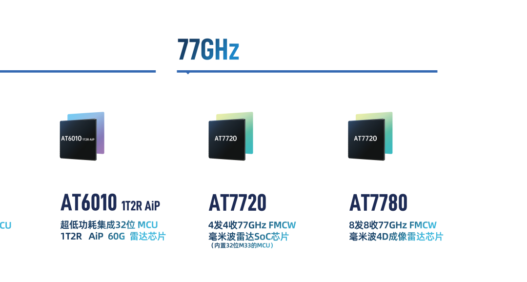 公司产品线中的5.8GHz、10.525GHz、24GHz、60GHz、77GHz系列雷达芯片、“BLE+雷达”双模芯片、车载毫米波雷达芯片、专用MCU芯片等产品,被广泛应用于智能物联网(AloT)、智慧照明、智能家电、智能家居、智慧城市管理、汽车ADAS等领域。