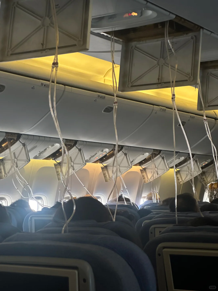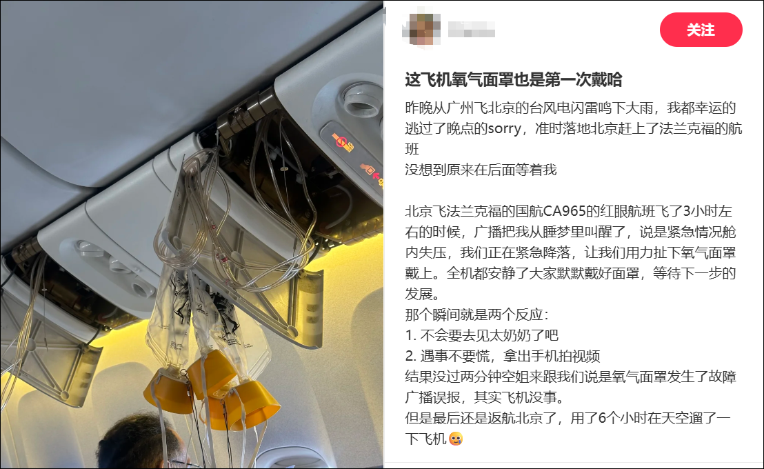 网友称,北京飞法兰克福的国航CA965的航班飞了3小时左右的时候,广播表示紧急情况舱内失压,正在紧急降落,让乘客用力扯下氧气面罩戴上。全机都安静了大家默默戴好面罩,等待下一步的发展。