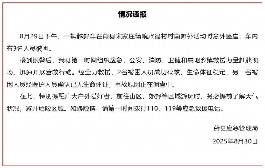 8月29日下午,一辆越野车在蔚县宋家庄镇嗅水盆村村南野外活动时意外坠崖,车内有3名人员被困。