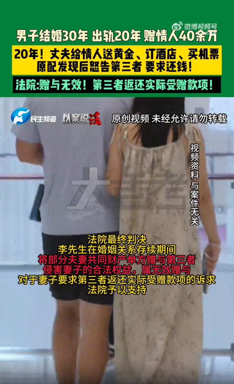 四川男子出轨20年赠情人40万原配起诉获支持