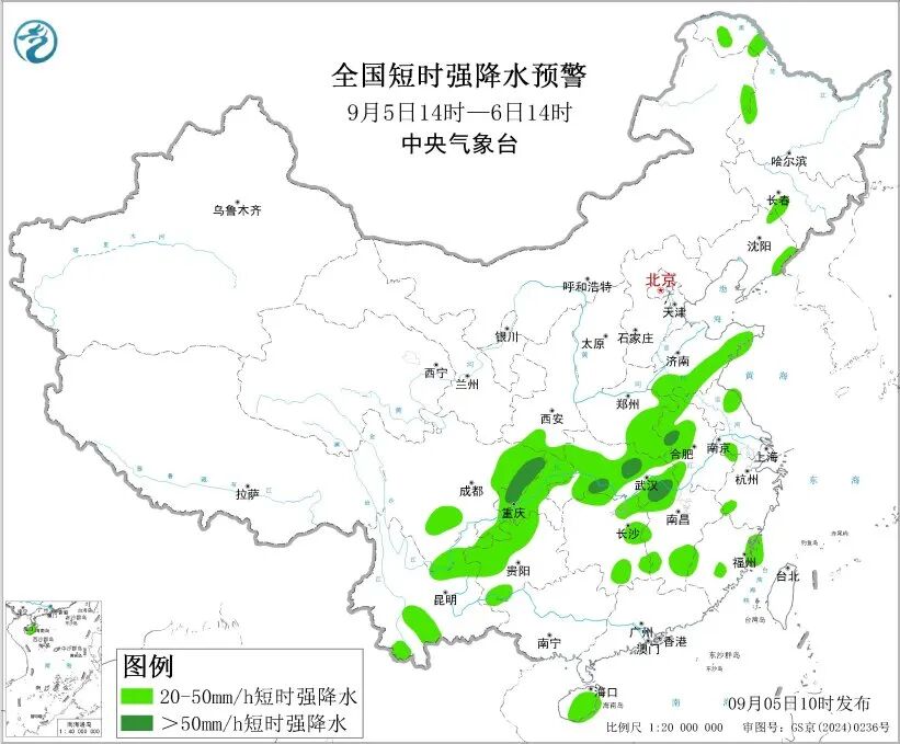 预计9月5日14时至6日14时,内蒙古东部、西南地区东部、江汉西部和南部、江淮北部、江南中部等地的部分地区将有8级以上雷暴大风或冰雹天气,其中,湖北西部、四川东部、贵州西北部等地的部分地区将有10级以上雷暴大风;内蒙古东部、东北地区中部、黄淮中东部、江汉、江淮西部、江南中部、西南地区东部和南部等地的部分地区将有小时雨量大于20毫米的短时强降水天气,其中,安徽中部、湖北东部和南部、四川东北部、重庆西部等地的部分地区小时雨量大于50毫米,最大可达80毫米以上。