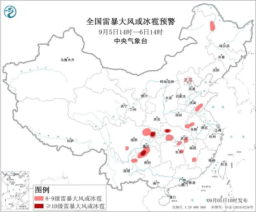 中央气象台9月5日10时继续发布强对流天气蓝色预警: