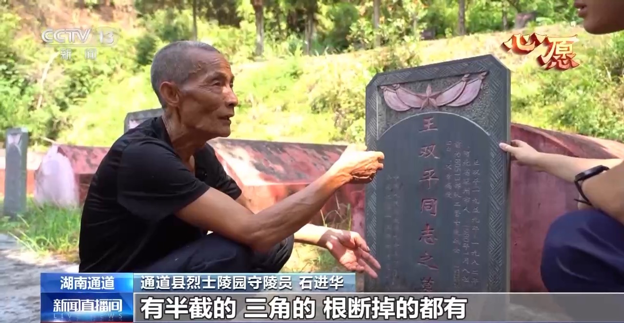 通道县烈士陵园守陵员 石进华:开始的时候一块木牌写着比如“王双平同志之墓”,边上就是“中国人民解放军”。那时候就是一块木板,我又不会写字,就编了号,工作人员来修的时候就刻在水泥板上。