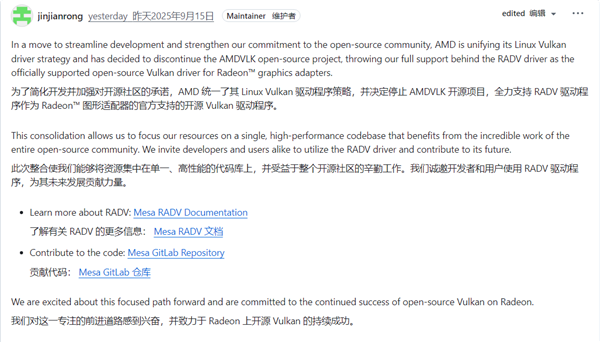 AMD在说明中坦言:"为统一Linux Vulkan策略、减少重复投入,我们决定放弃AMDVLK,把全部人力与代码贡献转投RADV,与社区共建单一、高性能且持续迭代的开源方案。"