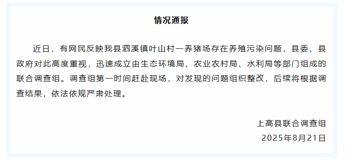 江西上高县养猪场被曝污染,官方回应加强监管并采取措施改善环境。