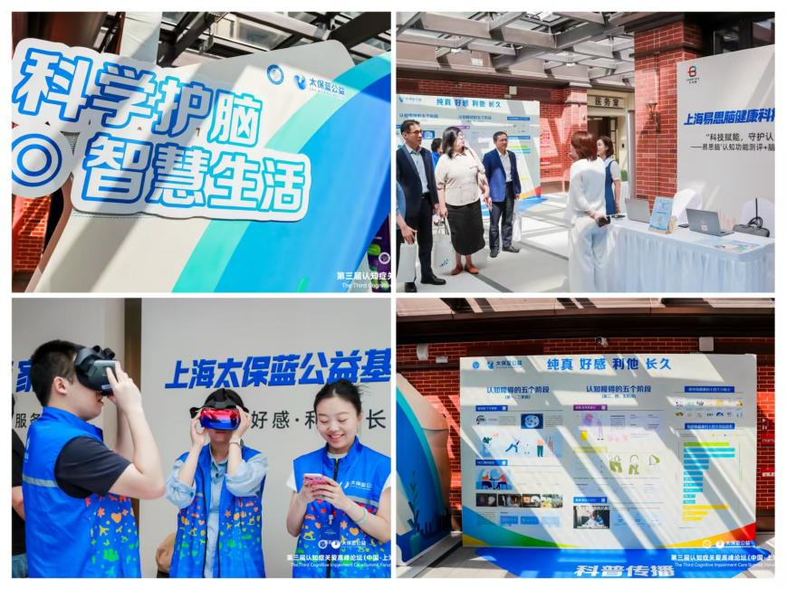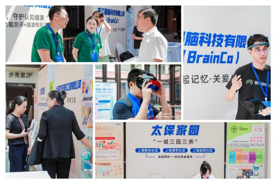 在数字训练工坊区,易思脑、强脑科技、科大讯飞等单位展示了认知功能脑机接口训练设备、BrainCo脑机康复系统、守护银发健康AI工具等;在健康补给站,嘉加安、法国达能展示了认知症居家适老化改造方案以及减缓认知下降的医学营养品“智敏捷”。同时,太保蓝公益携杉泰科技、太保家园等太保集团健康养老专业机构在现场呈现了公司在健康养老领域的产品和服务。太保蓝公益志愿者为与会嘉宾提供了脑健康科普及干预工具的讲解演示、互动操作以及指引咨询等暖心服务。