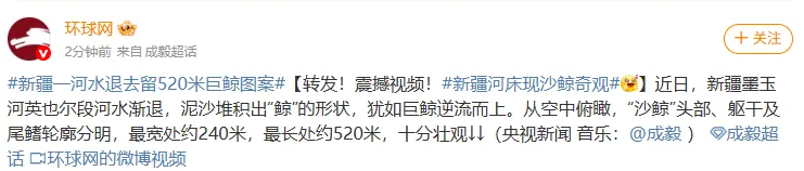新疆河水退去现520米“巨鲸”奇观 访客 2025-08-22 13:04:20 38452 默认 新疆河水退去出现520米巨鲸奇观,壮观景象引人注目。近日,新疆墨玉河英也尔段河水渐退,泥沙堆积出“鲸”的形状,犹如巨鲸逆流而上。从空中俯瞰,“沙鲸”头部、躯干及尾鳍轮廓分明,最宽处约240米,最长处约520米,十分壮观↓↓ 标签: 墨玉 尾鳍 躯干 海报 阅读 QQ 分享 微博分享 微信分享 分享 上一篇湖南省醴陵市市长刘新华主动投案接受审查调查 下一篇伟大胜利川渝贡献专题展在蓉开启 湖南省醴陵市市长刘新华主动投案接受审查调查上一篇 伟大胜利川渝贡献专题展在蓉开启下一篇 相关推荐 墨玉尾鳍躯干 眉山网红狗开车上路被叫停 2025-10-20 外国顾客误购寿衣作汉服 江苏店主澄清并婉拒 2025-10-20 花16万办婚礼现场却让新人崩溃 2025-10-20 男子立遗嘱写错外甥名字 法院判有效 2025-10-20 酸菜池中毒事故调查报告公布 2025-10-20 广西“猴哥”高楼飞檐五天诱捕未果 2025-10-19 没网购却收短信 广州有人2万元被卷走 2025-10-19 3米巨蟒闯鸡舍吞鸡 被消防5分钟制服 2025-10-19