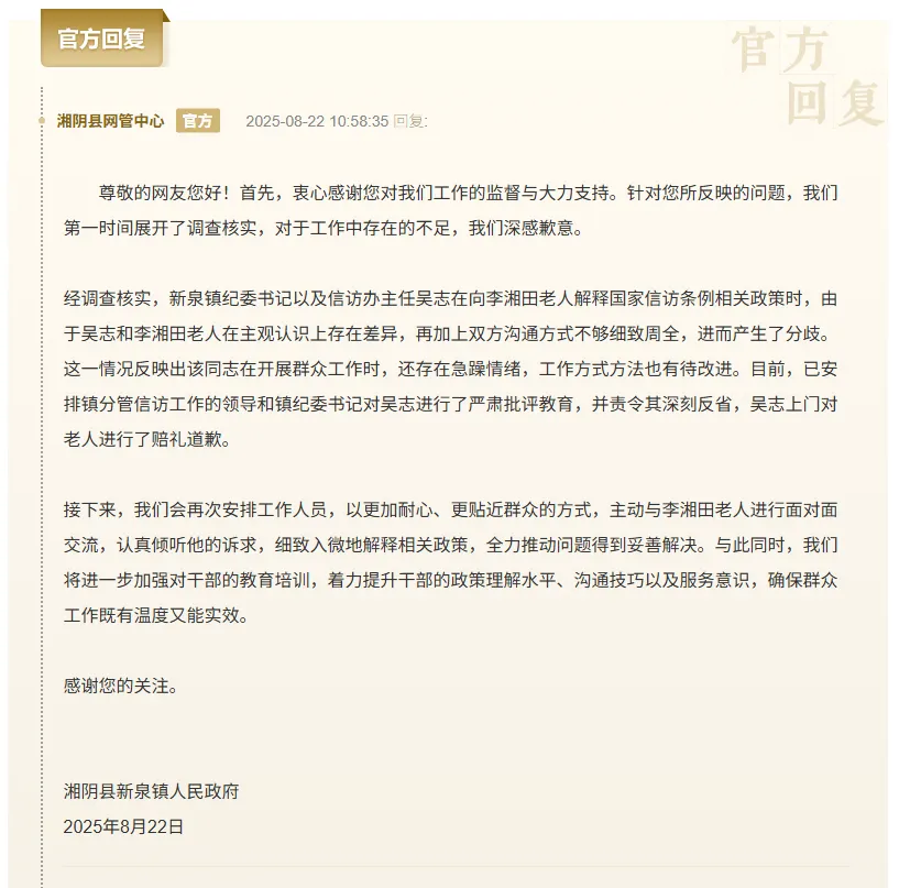 72岁老人信访遭干部辱骂,当地政府已对此事进行回应,表示将依法处理并保障信访人的合法权益。...
