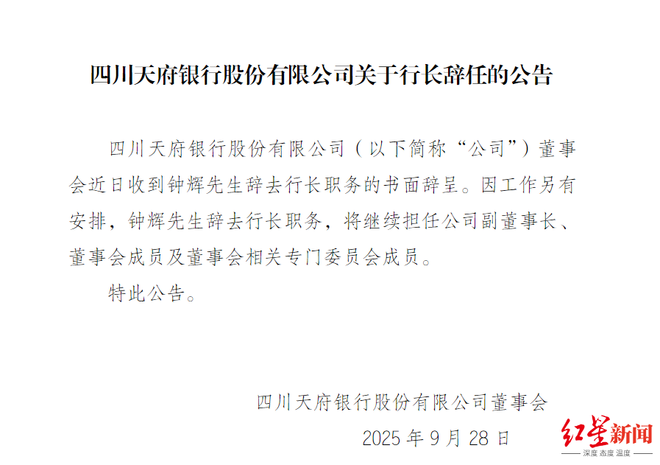四川天府银行行长钟辉辞职后仍任副董事长,该消息涉及银行业内部人事变动。