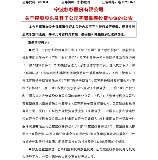 今年3月,杉杉集团及朋泽贸易被浙江省宁波市鄞州区人民法院裁定进行实质合并重整,并于2025年6月9日发布《杉杉集团有限公司关于公司及全资子公司实质合并重整案公开招募重整投资人的公告》,依据相关法律规定公开招募重整投资人。
