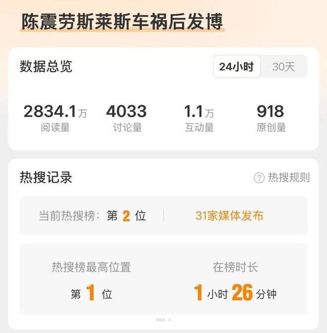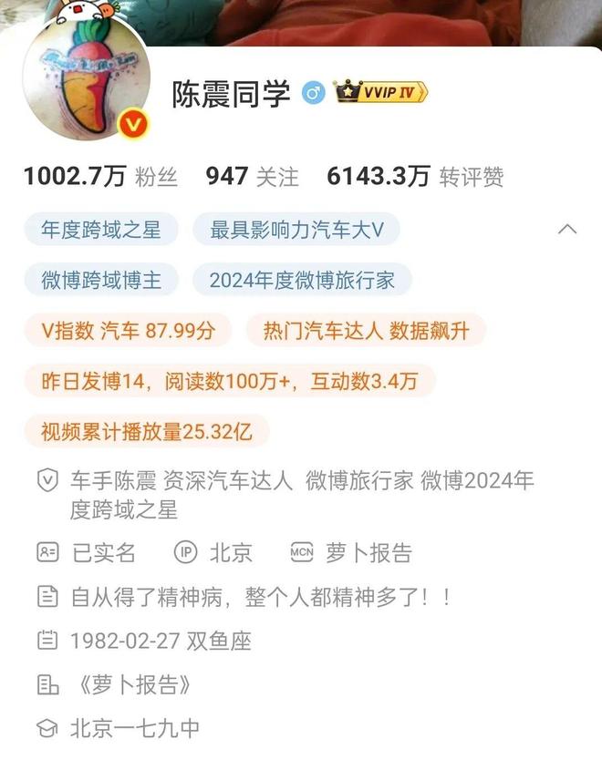 另据记者查询发现,陈震2023年曾在微博发文称自己买车险只买交强险,原因是自己开车规矩而且车多,所以买车损险不划算。