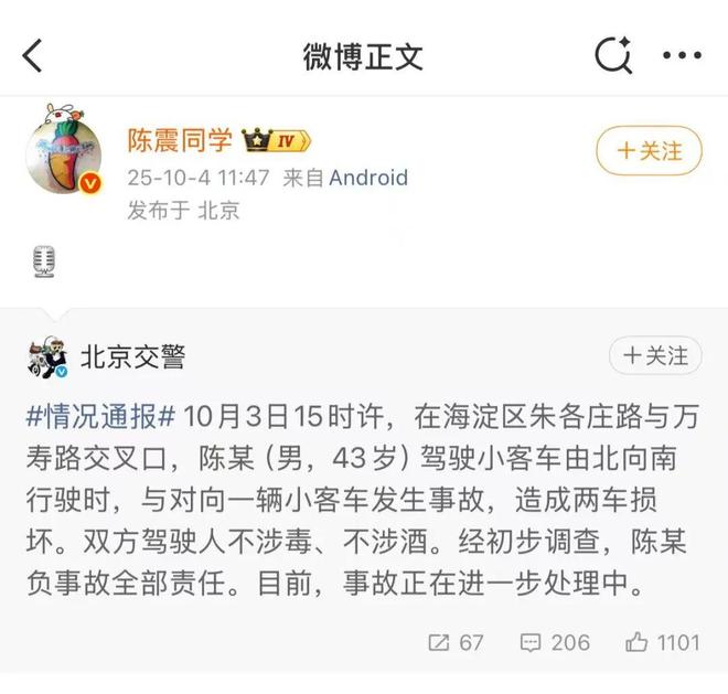 随后,@陈震同学 微博转发北京交警通报,并配文“”。
