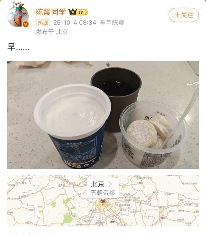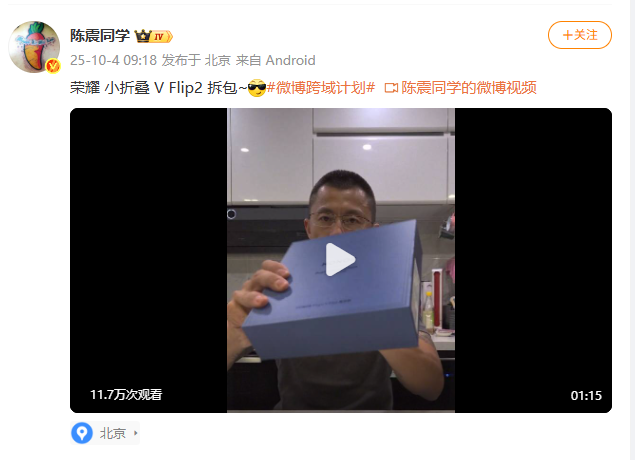 10月4日早上,陈震更新微博,只发了一个字“早”,随后又更新了一条“荣耀 小折叠 V Flip2 拆包”视频,并未就昨天疑似发生交通事故一事做正面回应。