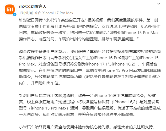 线上客服与用户沟通时,将设备型号标识符与设备型号混淆,误称是一台iPhone 16发出泊车辅助指令,导致用户错误理解,传递了不准确的信息造成一系列误会,小米对此表示歉意。