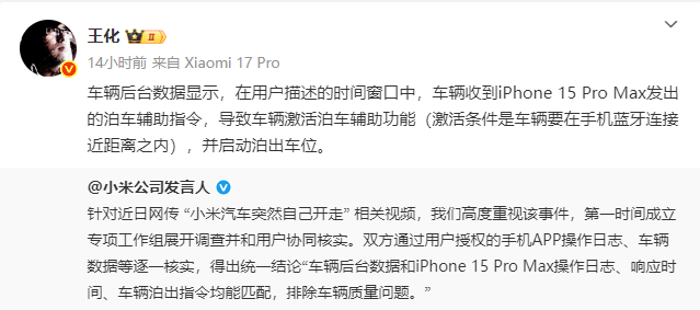 当天晚间,小米集团公关部总经理王化转发上述微博,并表示:“车辆后台数据显示,在用户描述的时间窗口中,车辆收到iPhone 15 Pro Max发出的泊车辅助指令,导致车辆激活泊车辅助功能(激活条件是车辆要在手机蓝牙连接近距离之内),并启动泊出车位。”