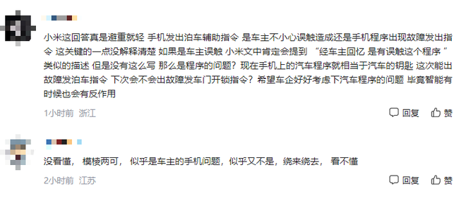 还有网友指出:“小米回答避重就轻。手机发出泊车辅助指令是车主不小心误触造成,还是手机程序出现故障发出指令?这一关键点没解释清楚。希望车企好好考虑下汽车程序的问题,毕竟智能有时候也会有反作用。”