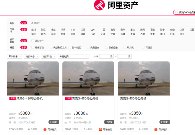 2024年2月至6月,一架停放于北京首都国际机场的湾流G450连续三次拍卖流拍,这也是“全国首例查封大飞机案”所涉的豪华公务机,产权持有人为Zola Group Limited,其起拍价从3850万元一度降至3080万元。