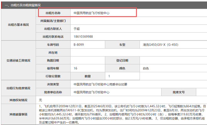 上述飞机的出租方为中国民用航空飞行校验中心,其成立于1989年5月,是中国民用航空局下属单位,承担中国内地、中国香港、中国澳门所有民用机场、军民合用机场和航路的各类导航、雷达、通信、助航设施设备及飞行程序的飞行校验任务。