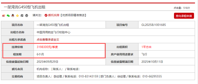 10月3日消息,近日,北京产权交易所挂出了一则湾流G450型飞机出租的信息。