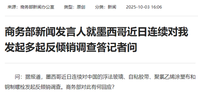 10月3日消息 今日,针对墨西哥近日连续对中国发起多起反倾销调查,商务部新闻发言人答记者问。