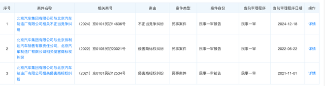 此外,2021-2024年间,北汽集团三次将北汽制造诉至法庭。其中,两次为侵害商标权纠纷,一次为不正当竞争纠纷。截至目前,暂未查询到这三起官司的结果。