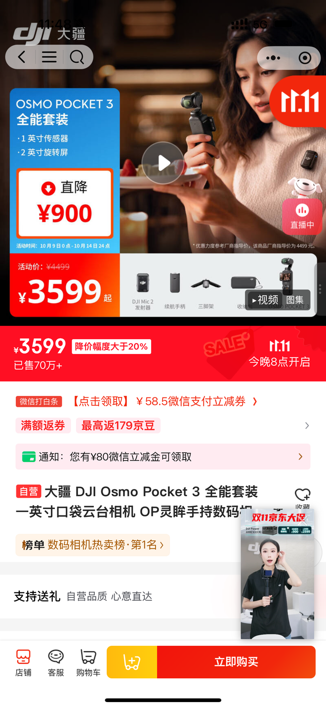 注意到,截至发稿,大疆的京东旗舰店直播间显示,云台相机Pocket 3最高降价900元可立即购买,降价700元的标准套装需预约,9日15:00至15:05抢购。Mini 4 PRo无人机降1478元,可直接购买。