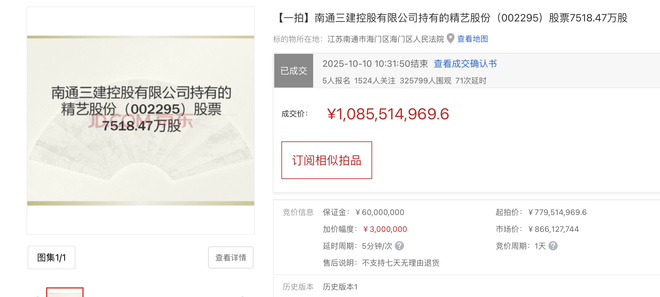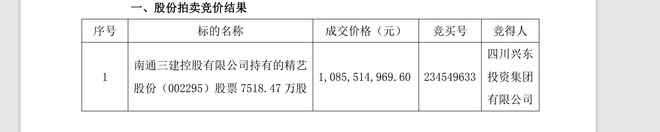 10月10日晚间,精艺股份公告称,公司控股股东南通三建控股有限公司(下称三建控股)所持有的7518.47万股公司股份(占公司总股本的29.99996%)网拍阶段已经结束,四川兴东投资集团有限公司(下称四川兴东)以约10.86亿元的总价款竞得。