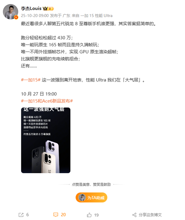 他表示,一加15这一波强到离开地表,性能Ultra我们在"大气层"。