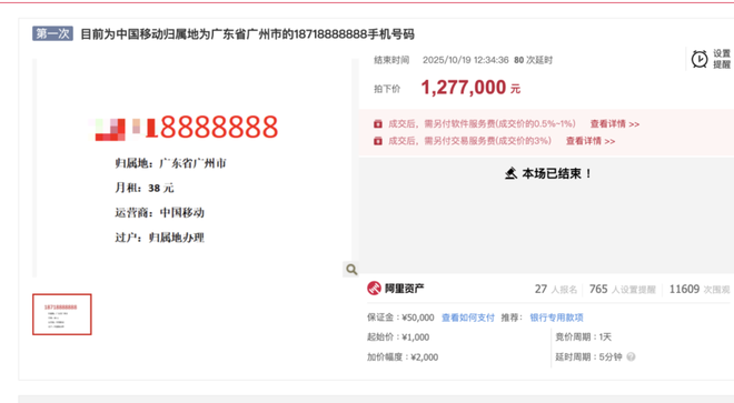 10月19日消息,今日中午,一个尾号为“8888888”的手机号码在阿里资产平台被成功拍卖,成交价为127万余元。