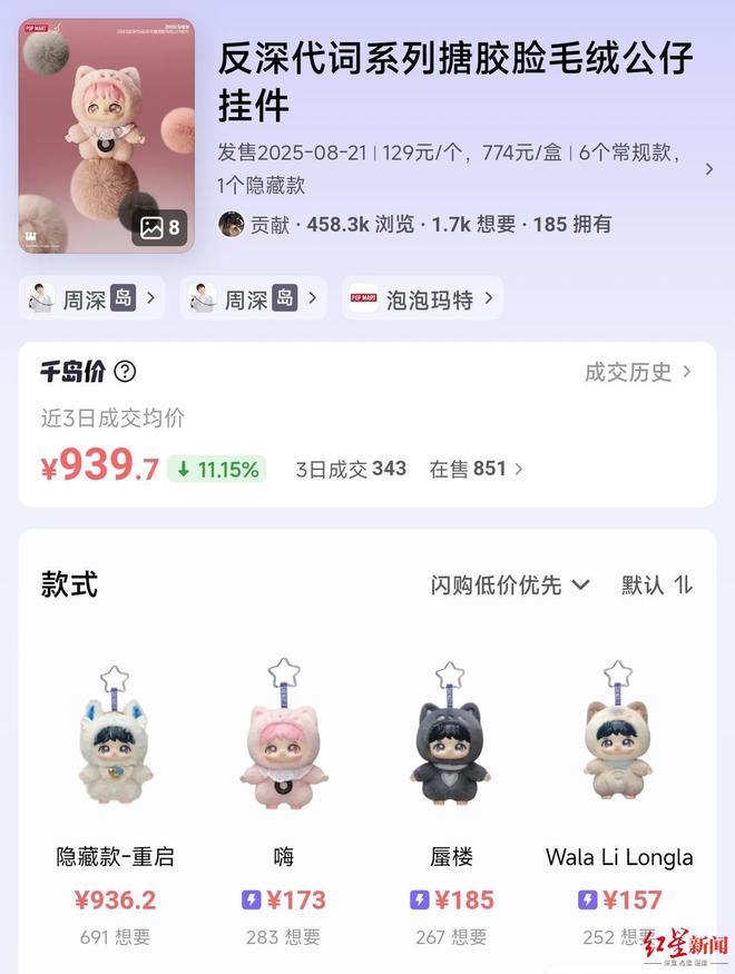 此前,有媒体报道,周深与泡泡玛特合作推出的“反深代词”系列搪胶脸毛绒公仔挂件盲盒,在发售前就被开出1800元转让隐藏款的高价,在发售后有粉丝表示“一娃难求”。注意到,目前,该款盲盒在二手交易平台的成交均价在939元左右。