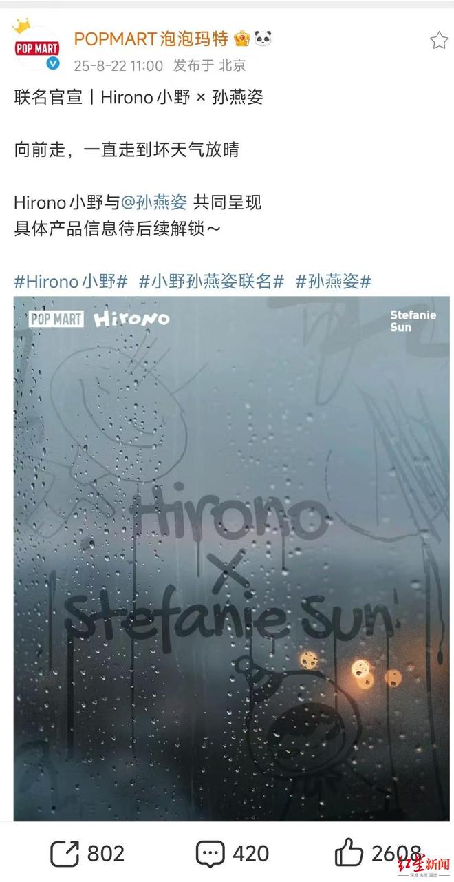 8月22日上午11时,泡泡玛特官方微博发布了旗下IP“Hirono小野”将与孙燕姿共同呈现联名产品的信息,截至目前,该信息共有802次转发,2608次点赞。