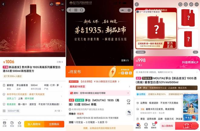 ▲淘宝、京东、抖音(从左至右)平台的茅台1935新品页面 图源:电商平台官网