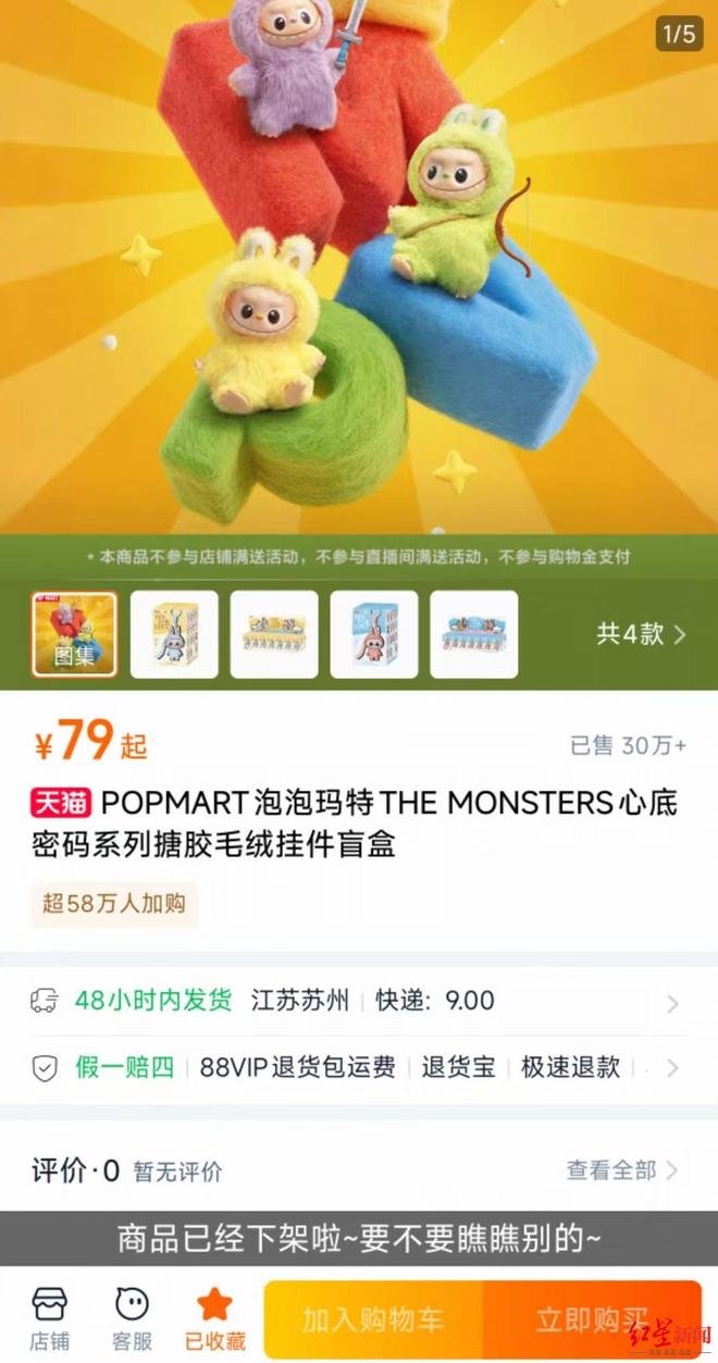 截至发稿,在淘宝平台,THE MONSTERS心底密码系列搪胶毛绒挂件盲盒显示已售超过30万件,抖音平台已售超15.5万件,京东平台已售超过70万件。