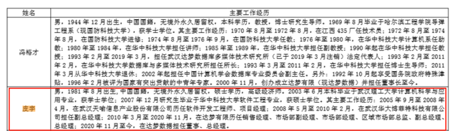 达梦数据2024年年报显示,皮宇,男,1981年8月出生,中国国籍,无境外永久居留权,硕士学历,高级经济师。2003年6月本科毕业于武汉理工大学计算机科学与应用专业,获学士学位;2007年12月研究生毕业于华中科技大学软件工程专业,获硕士学位。