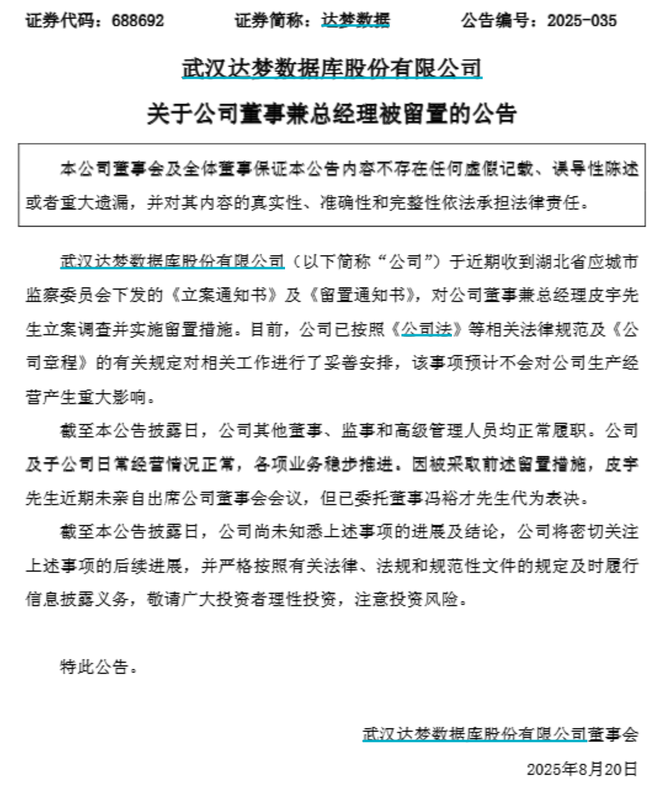 8月19日晚,达梦数据(688692.SH)公告称,公司于近期收到湖北省应城市监察委员会下发的《立案通知书》及《留置通知书》,对公司董事兼总经理皮宇立案调查并实施留置措施。
