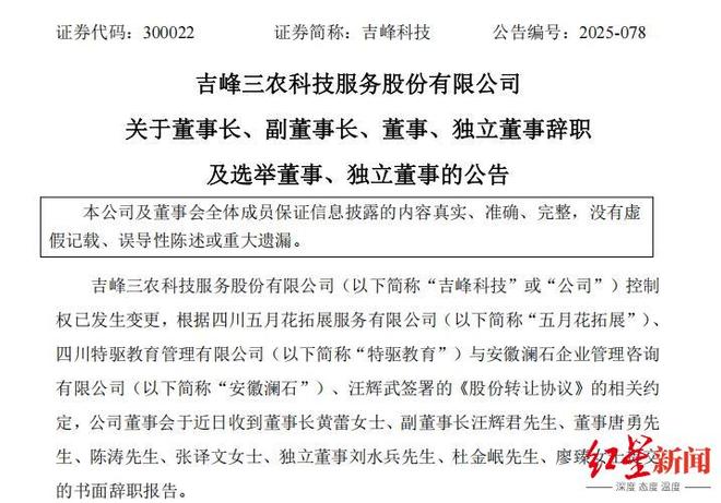 农机流通行业龙头企业吉峰科技(300022.SZ)实控权易主后,高层也随之迎来“大换血”。