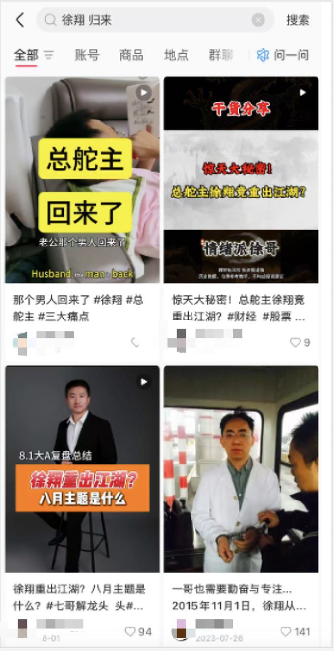 今日,从知情人士处了解到,视频号平台方已经对这些“虚假股神”的内容做出处理。抖音相关负责人也回复称,已回查处置53个仿冒“徐翔”的账号,并新增拦截策略。同时,对借“徐翔归来”蹭热炒作、违规荐股的内容予以处置,对违规账号处置禁言。