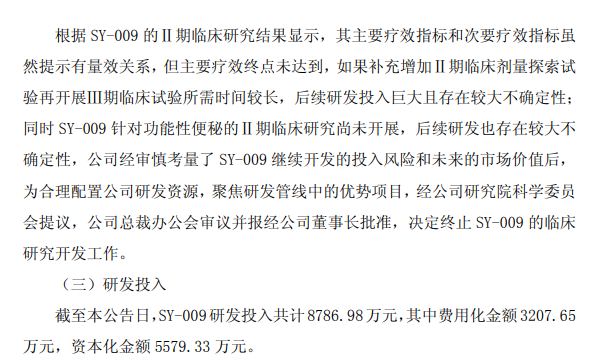 一款早在七年前就拿到临床试验批件的糖尿病新药,为何选择终止?亚宝药业解释称,根据SY-009的Ⅱ期临床研究结果,主要疗效终点未达到,如果补充增加Ⅱ期临床剂量探索试验再开展Ⅲ期临床试验所需时间较长,后续研发投入巨大且存在较大不确定性;同时SY-009针对功能性便秘的Ⅱ期临床研究尚未开展,后续研发也存在较大不确定性。