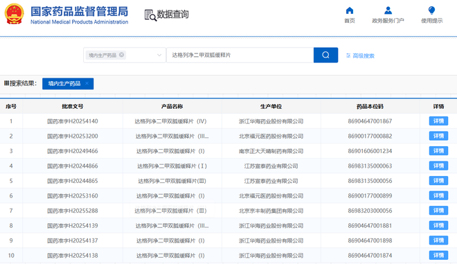国内厂商则将目光瞄准达格列净二甲双胍缓释片。据国家药监局官网,截至目前,国内已有华海药业(600521.SH)、福元医药(601089.SH)、南京正大天晴、江苏宣泰药业等7家药企获得该药品生产批文。
